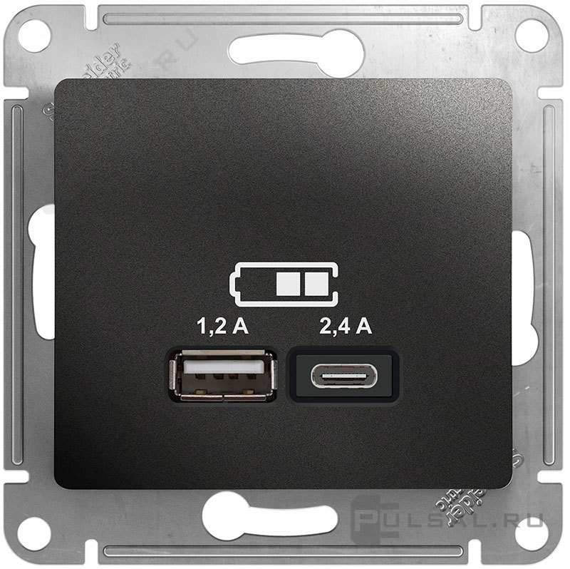 Розетка USB type-C + type-A, 2.4А Glossa, USB type-C 5V, USB type-A 5V, двойная, цвет - антрацит