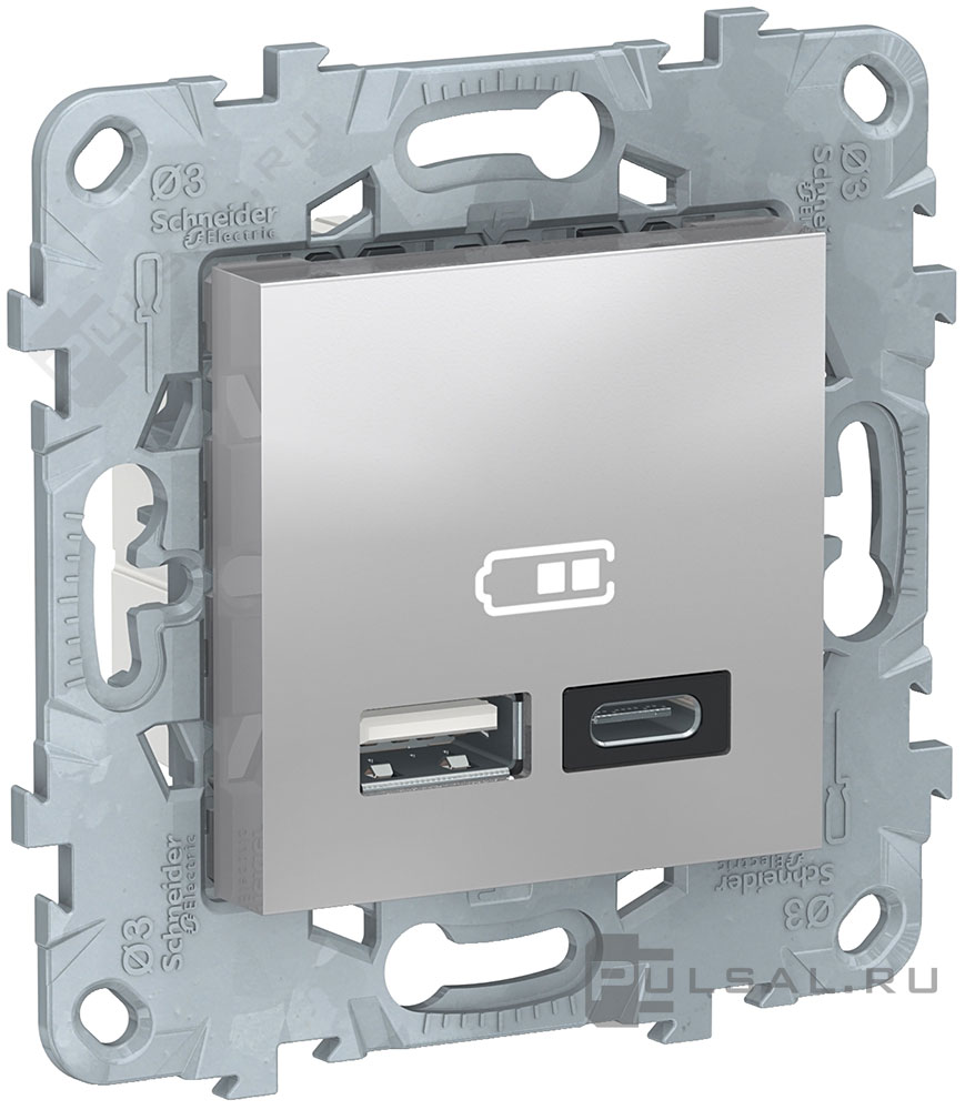 Розетка USB type-C + type-A, 2.4А Unica New Pure, Unica New Studio, USB type-C 5V, USB type-A 5V, двойная, цвет - алюминий
