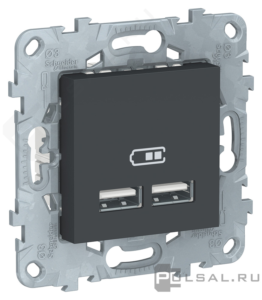 Зарядка USB, 2,1А Unica New Pure, Unica New Studio, USB type-A 5V, двойная, цвет - антрацит