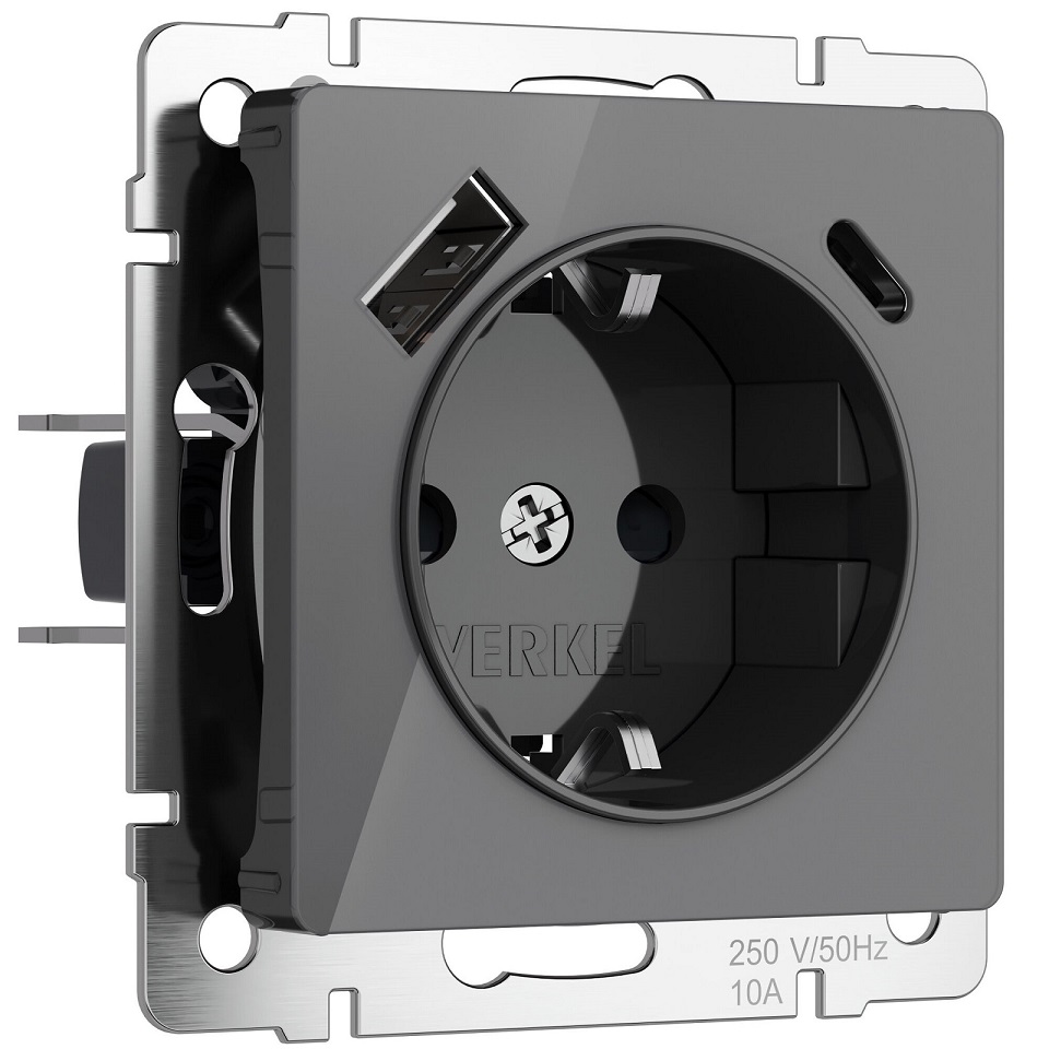 Розетка USB A+C, 3.0А с электрической розеткой Alumax, Split, Slab, Senso, Baguette, Acrylic, Platinum, Elite, Snabb, Stream, Flock, Stark, Fiore, Favorit, Diamant, Aluminium, Antik, Metallic, USB type-C 5V, USB type-A 5V, двойная, цвет - графит акрил